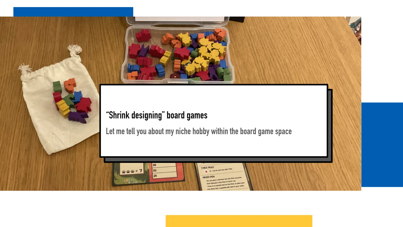 What I mean with shrink design is that I enjoy taking existing board games that often come in big boxes and look into what I can do (or what others have done) to shrink them down into travel size format.