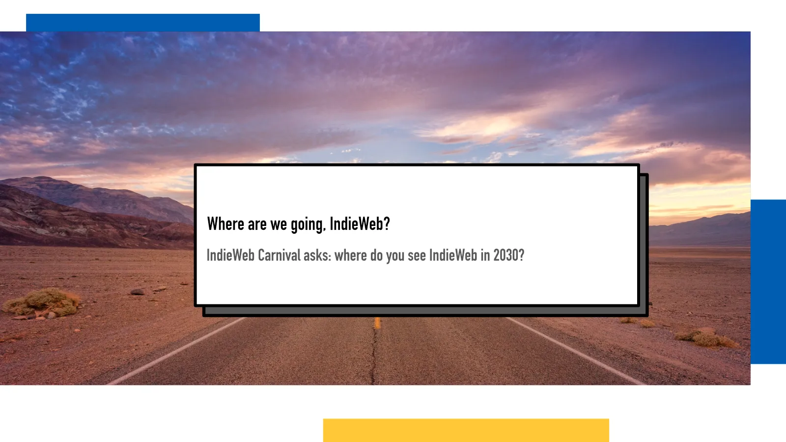 Welcome to the last IndieWeb Carnival of 2025. Having been a part of this wonderful community for years now and having thought about the IndieWeb from various perspectives, I have plenty of ideas about where I hope we are headed in the near future. And I am sure you do too. So tell us, where do you see the IndieWeb in 2030, just five short years from now?