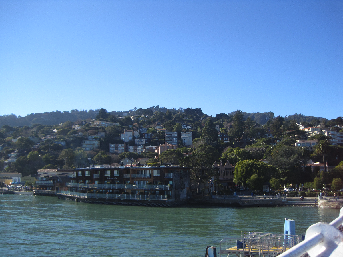 Lauttakyyti Sausalitoon maksoi jotain 20 $ hujakoilla kahteen suuntaan, joten ostin lipun ja aikaa tappaakseni söin paikallisessa meksikolaisessa lautasellisen maissilastuja ja suht äkäistä salsaa. Vielä lautalle astuessanikaan en oikeastaan tiennyt mikä Sausalito oikeastaan olisi ja miksi sinne mennään, mutta kauniissa kesäilmassa se ei oikeastaan haitannut. Noin viisisataa henkeä imenyt lautta puksutteli rauhalliseen lauttamaiseen tahtiinsa San Franciscon lounaisrannasta kohti pohjoista, ohi Alcatrazin ja lopulta rantautui hulppean kauniiseen Sausalitoon, joka paljastui kaupungiksi, joka näkyy asunnon ikkunastani tätä juurikin kirjoittaessani.