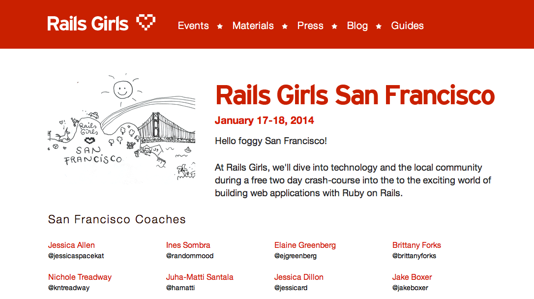 Loput työviikosta painetaan oman projektin kimpussa ja viikonloppuna pääsee pitkästä aikaa opetushommiin, kun Rails Girls rantautuu jälleen San Franciscoon. Ensimmäisestä kokemuksestani Rails Girls -koutsina voi lukea lontoon murteella toisesta blogistani http://passionfordata.wordpress.com/2013/11/09/rails-girls-building-the-future/. Suomessa majaileville tytöille voin mainostaa Turun Rails Girlsia, joka järjestetään tänä keväänä.