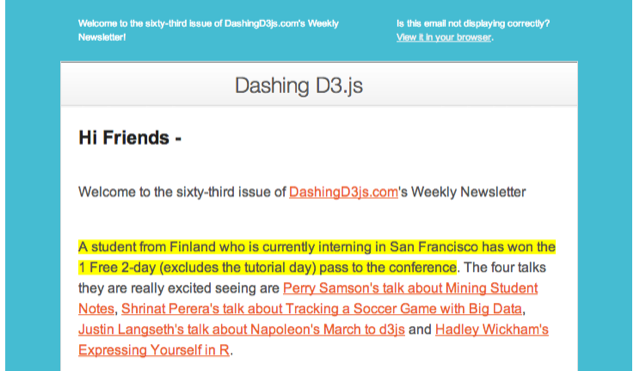 Tänään työpäivä sai hurjan käänteen, kun DashingD3js newsletteriä pitävä kaveri ilmoitti, että olin voittanut kahden päivän lipun Strata-konferenssiin Santa Claraan helmikuun puolivälissä: konferenssi on maailman kovin data-alan konffa, jonne pääsystä olen haaveillut jo vuosia ja nyt napsahti homma kohdilleen, kun n. 1500$ arvoiset liput napsahti kouraan ja jälleen yksi unelma voidaan viivata yli TODO-listalta. Ihan mieletöntä. Olin viime viikolla osallistunut kisaan, jossa piti kertoa, mitkä presikset konferenssisa tahtoisi nähdä ja maustoin tarinaa maisemia kuvailevalla tyylilläni, joka näemmä osui kohteeseensa.