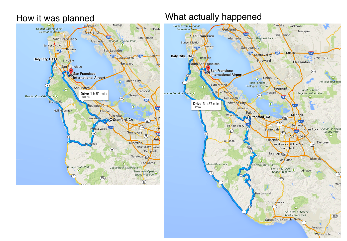 Kuten startup-henkeen kuuluu, suunnitelma ja toteutus eivät aivan vastanneet toisiaan, mutta loppujen lopuksi päädyttiin pitämään enemmän hauskaa kuin suunnitelmiin kuului, nähtiin mielettömiä maisemia ja nautittiin elämästä. Koska täällä puhelinverkkojen toiminta on erittäin kyseenalaista, ei Google Mapsilta saatu vinkkejä kuin aina silloin tällöin, joten mentiin suht paljon ohi alkuperäisestä risteyksestä ja päädyttiin lähes Santa Cruziin saakka. Kuitenkaan moottoritiereitti Santa Cruzista Palo Altoon ei kuulostanut houkuttelevalta, joten päätimme oikaista vuorien ja metsien läpi. Ja voi veljet, mikä ratkaisu se olikaan.